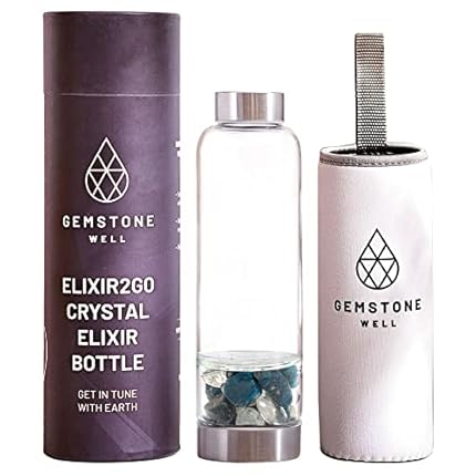 Crystal Water Bottle Elixir Set | Genuine Blue Apatite & Clear Quartz Gemstones | Black Neoprene Sleeve | Created For The Healing Enthusiast To Drink Gem Infused Water