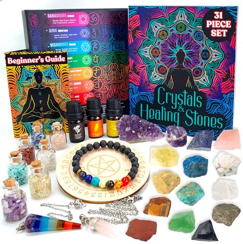 Crystals and Healing Stones Set 31Pcs – Healing Crystals & Stones – 14 Real Raw Chakra Rocks, 7 Gemstones Bottles, 3 Essential Oils,Pendant Necklace, Pendulum Board, Amethyst Cluster, Bracelet & Guide