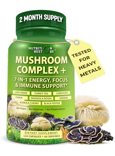 Organic Mushroom Complex: Lion’s Mane, Turkey Tail, Cordyceps, Chaga, Contains Naturally Occurring Beta Glucans – Organic Energy & Immune Support Blend: Rhodiola Rosea, Ginseng & Acerola Cherry 120Ct