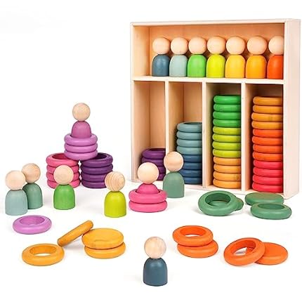 Montessori Toys Wooden Color Sorting Stacking Rings Toy Rainbow Wooden Peg Dolls Counting Toys Circular Building Blocks Stacking Game Preschool Learning Education Fine Motor Skill Toys for Toddlers