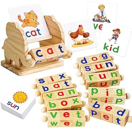 Montessori Learning and Educational Toys Gifts for Kids 3 4 5 Years, Wooden Reading Blocks Toys, Learning Activities for Preschool Kindergarten, Turning Rotating Matching Flash Card Games