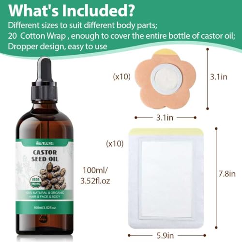 CASTOR OIL PACK KIT – You will get cold pressed organic castor oil*1 in glass bottle (3.52oz/100ml), round patches*10,square patches*10,complete accessories for castor oil health enthusiasts,perfectly meet your body care needs