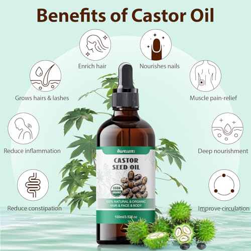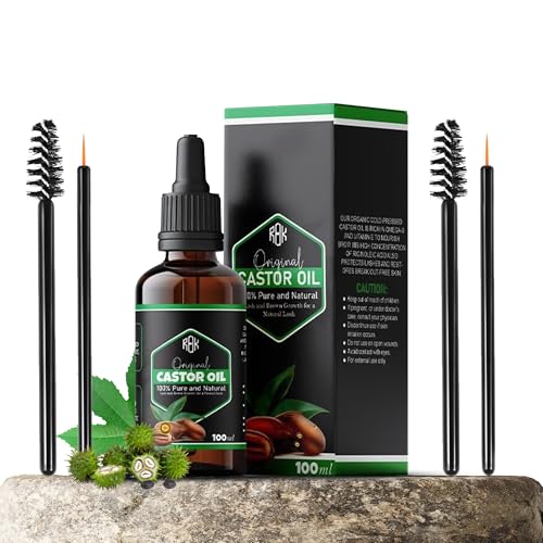 Organic Castor Oil 100% Pure and Natural Cold pressed castor oil for Haircare and Skincare Promotes Lash and Brown Growth for a Natural Look (3.4 fl oz + 2x Eyelash Kit)