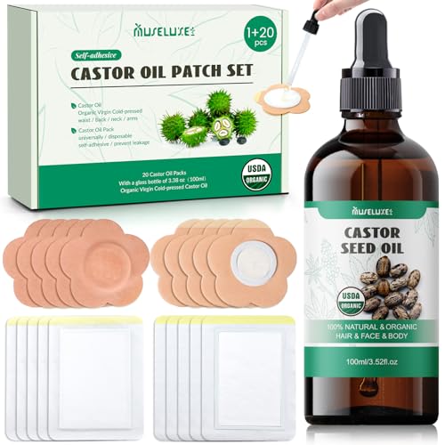 21 Pcs Castor Oil Pack Wrap,Castor Oil Organic Cold Pressed Unrefined Glass Bottle(3.5oz) for Liver Detox,Stomach,Neck,Knee,Organic Cotton Self-Adhesive Patches for Convenient Use