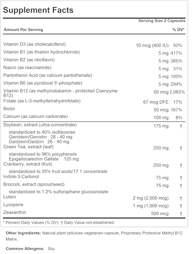 Superior pure bio-active ingredients – Delivers high levels of beneficial isoflavones from Soy (Genistein and Daidzein), Vitamin D3, Calcium, Green tea extract with 125 mg EGCG, sulforaphane from Broccoli extract, Cranberry extract, Lutetine, Lycopene, Zeaxanthin, Natural B12 (Methylcobalamin) and Folate Complex. Contains no Milk / Dairy-Free, Gluten-Free; no yeast, wheat, sodium, salt, sugar, fat, cholesterol, color, preservative or manufacturing additives. Contains Soy.