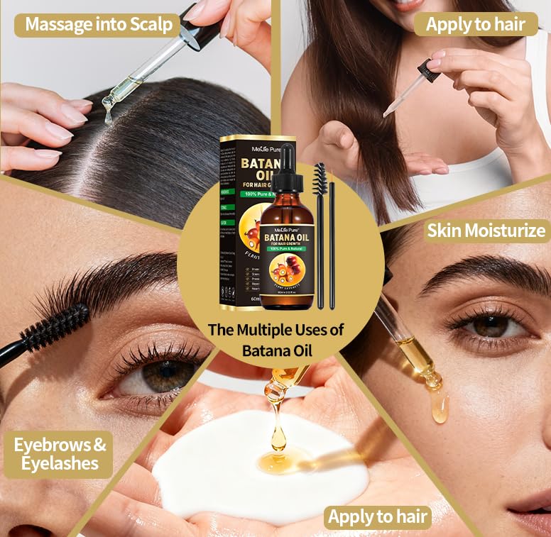 Batana Oil for Hair Growth–4Pc Set: includes a 2 oz bottle of raw Batana oil, 4 oz moisturizing Batana hair mask paste, a lash wand, and a brow brush for targeted application. Ideal for revitalizing dry scalp, restoring thinning edges, and enhancing brow/lash growth.