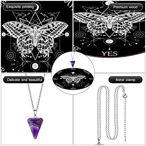 Interesting design: the surface of the wooden pendulum board is designed with attractive butterfly and words, including astrolabe and text descriptions such as yes, no, maybe, which can help you make your own decisions and add more fun, and the amethyst crystals help clear negative energy and bring good luck