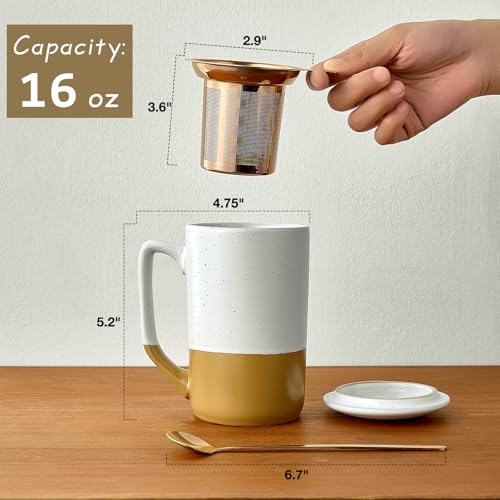 Ceramics Large Tea Cup with Loose Leaf Infuser, Spoon and Lid, 16 oz Tall Coffee Mug, Microwave and Dishwasher Safe, Rustic Matte Ceramic Glaze, Tea Strainer, Amber