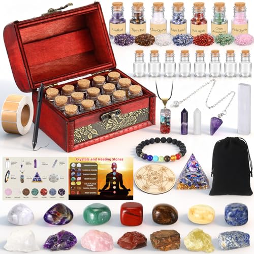64 Pcs Crystals and Healing Stones Set for Meditation,7 Raw Chakra Stones Crystals Kit Pyramid Reiki Real Crystal Stone with Wooden Box, Lava Bracelet, Chakra Necklace, Gifts for Crystal Beginners
