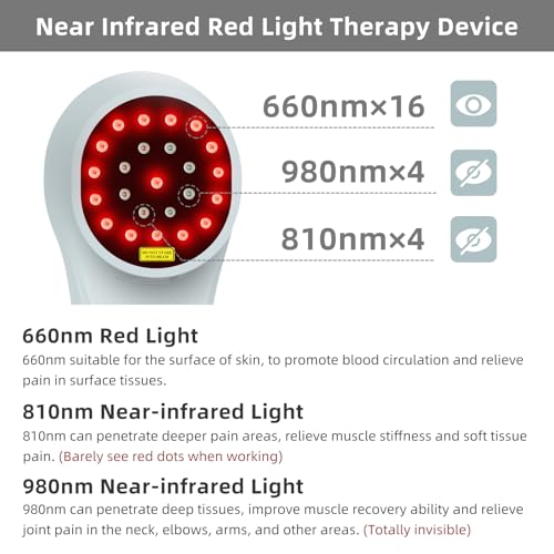 Infra Red Light for Body: Combind with 4pcx980nm and 4pcx810nm and 16pcx660nm. 660 nm red light therapy suitable for the surface of skin,to promote blood circulation and relieve pain in surface tissues. Hand held red light therapy of 810 nm can penetrate deeper pain areas, relieve muscle stiffness and soft tissue pain. 980nm can penetrate deep tissues and relieve joint pain in the neck, elbows, arms, back, knees and other areas.(980nm can’t be seen when it’s working which is normal)