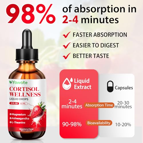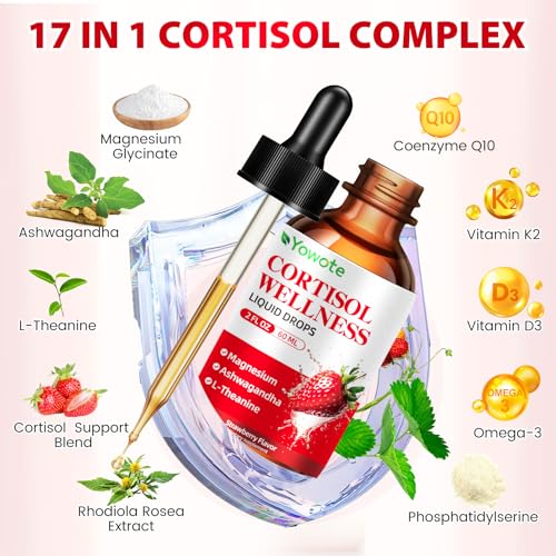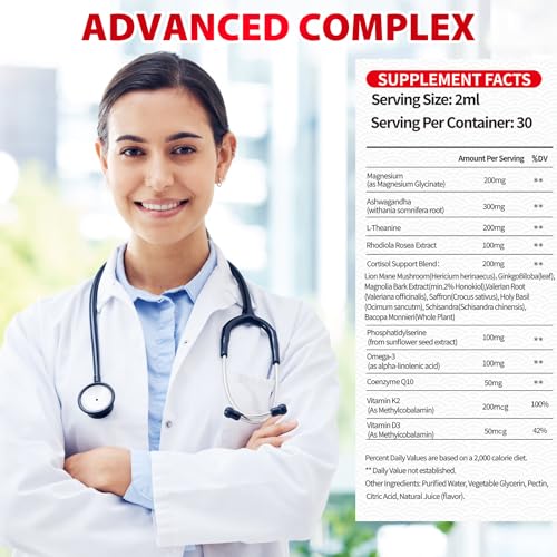 Cortisol Support Supplements for Men and Women, Cortisol Detox Hormone Balance with Magnesium, Ashwagandha, L-theanine, Phosphatidylserine for Lower Cortisol, Calm, Mood Support (60ML, strawberry)