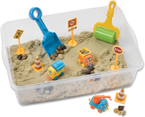 ALL-IN-ONE PLAYSET INCLUDES: This complete kit features a reusable storage bin, 2.5 lbs of sensory sand, mini dump truck, cement mixer, roller and shovel tools, construction signs, cones, pebbles, and a lid that doubles as a play surface