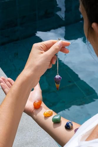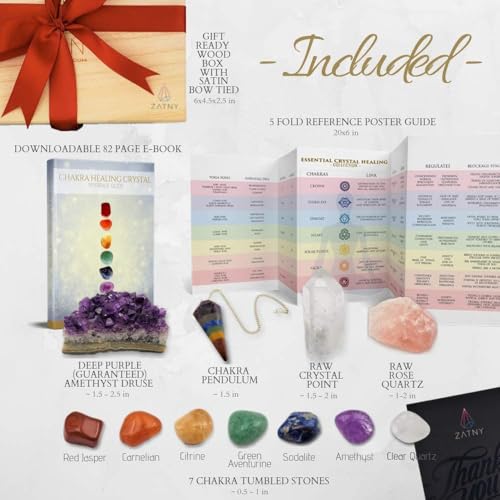 NATURAL CRYSTALS AND HEALING STONES KIT – The Essential Healing Crystal Sets Gemstones is the best value for a complete Charka Healing Crystal kit for you to immediately get the most from you healing crystal and balance your chakras. It includes 7 chakras tumble stones (clear quartz, amethyst, sodalite, green aventurine, citrine, carnelian and red jasper), seven chakra pendulum crystal, clear crystal point, amethyst cluster, raw rose quartz + 20×6 Quick Reference Poster Guide + 82 Page E-book