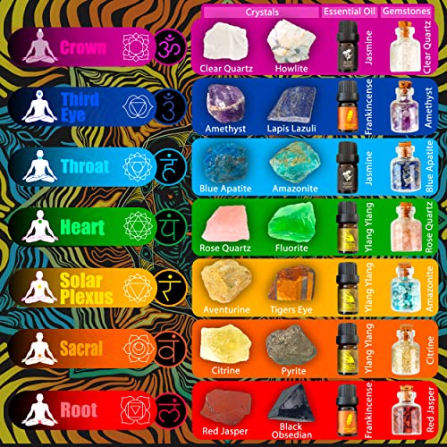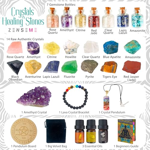 Crystals and Healing Stones Set 31Pcs – Healing Crystals & Stones – 14 Real Raw Chakra Rocks, 7 Gemstones Bottles, 3 Essential Oils,Pendant Necklace, Pendulum Board, Amethyst Cluster, Bracelet & Guide