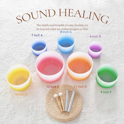 RYAN DVAN 432Hz 7-12 inch Crystal Singing Bowl Set of 7 with Free Carrying Case, Frosted Quartz Sound Bowls for Chakra Healing, Meditation,Yoga,Sound Therapy,Mindfulness,Relaxation & Stress Relief