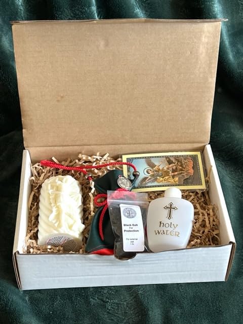 Energy protection kit includes: 4 variety incense samplers- Arch Angel Michael Candle- Black salt- Beautiful hand made pouch ( to hang the black salt ) – Holy water and Prayer card .