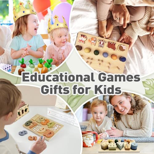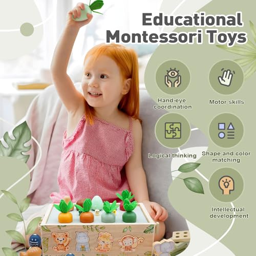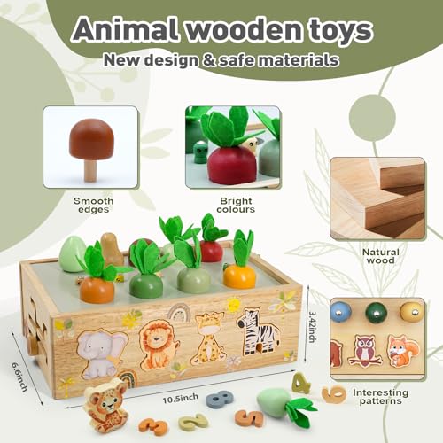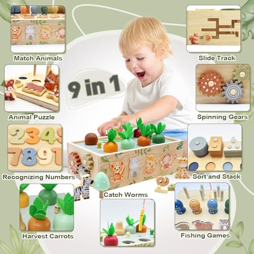 【9-in-1 Wooden Montessori Toys Set】Unbeatable value packed in one box! Perfect gifts for one year old boys & girls (1-4 years). Includes: 13 animal blocks, 6 carrots, 5 worms, mushrooms + activities: fishing, gear play, shape sorting, number learning. Combines montessori toys for toddlers, pretend play, and matching toys – replaces multiple single toys! Safe wooden toys for 1+ year old​with non-toxic UV paint (EN71-3/ASTM certified). Ideal educational toys for 2+ year old to boost motor skills & cognition.