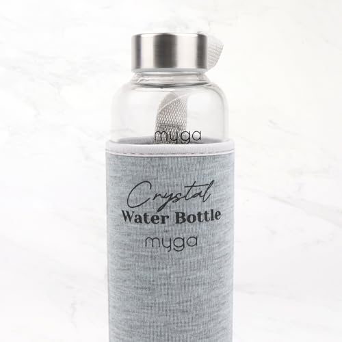 Myga Clear Quartz Crystal Water Bottle,16.9OZ 500ml Glass Drinks Bottle with Natural Healing Crystal and Neoprene Sleeve for Wellness and Self-Care