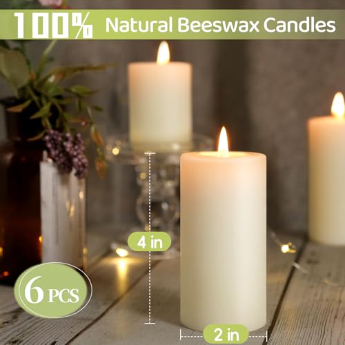 Natural Beeswax Pillar Candles,100% Pure Beeswax Candles-258 Hours Long Burning,Off-White Unscented Bees Wax Candles for Home,Prayer,Dripless Smokeless Organic Pillar Candles Bulk-2x4in-6 Pack