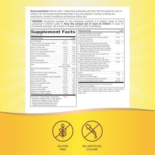 Nature’s Way Women’s Ultra Multivitamin is a complete high potency daily multivitamin for women. Promotes energy metabolism and muscle function.* With high potency B-vitamins to help convert food into fuel.* Contains food-based Orchard Fruits & Garden Veggies powder blend (60 mg per serving), plus Cardio, Daily Greens, Hair, Skin & Nails, and more blends. Gluten-free. No artificial colors.*This statement has not been evaluated by the Food and Drug Administration. This product is not intended to diagnose, treat, cure, or prevent any disease.