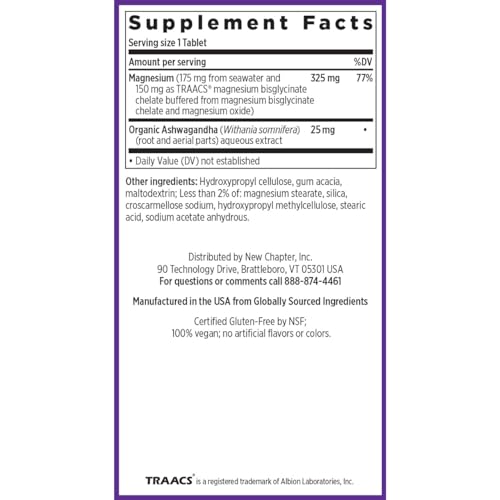 New Chapter Magnesium + Ashwagandha Supplement, 325 mg with Magnesium Glycinate for Muscle Relaxation & Recovery, Heart, Nerve & Bone Health, 2.5X Absorption, Non-GMO – 60 ct (2 Month Supply)