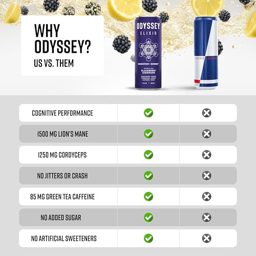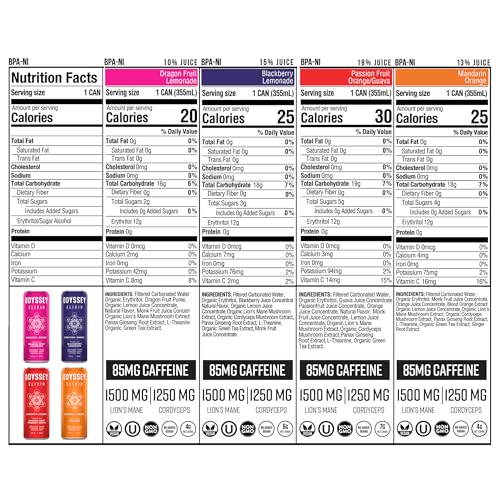Odyssey Elixir Cognition + Sustainable Energy – Lion’s Mane, Cordyceps, L Theanine, Ginseng & 85mg Green Tea Caffeine – 0 Added Sugar – No Jitters or Crash -Variety Pack – 12 Fl oz, 12 Pack