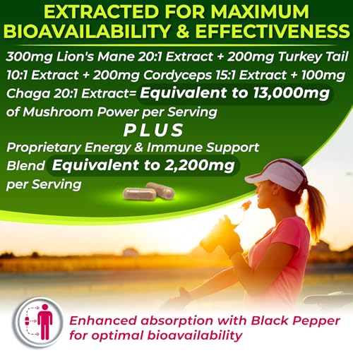 Enhanced Bioavailability with Mushroom Extracts & Organic Black Pepper: 300mg of organic Lion’s Mane 20:1 extract, 200mg of organic Turkey Tail 10:1 extract, 200mg of organic Cordyceps 15:1 extract, plus 100mg organic Chaga 20:1 extract, delivering the equivalent of 13,000mg of organic mushroom strength per serving, enhanced with organic black pepper for optimal absorption.