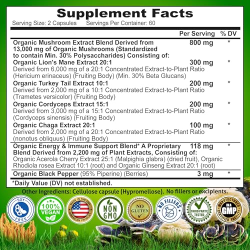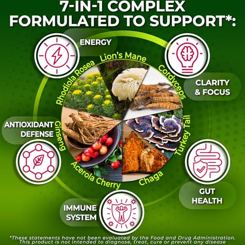 Organic Mushroom Complex: Lion’s Mane, Turkey Tail, Cordyceps, Chaga, Contains Naturally Occurring Beta Glucans – Organic Energy & Immune Support Blend: Rhodiola Rosea, Ginseng & Acerola Cherry 120Ct