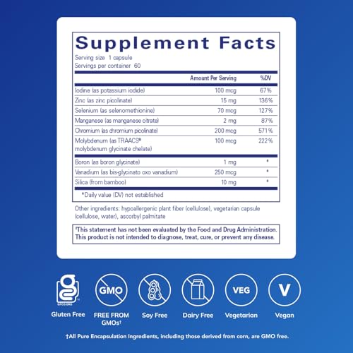 Essential Minerals: Pure Encapsulations Trace Minerals delivers a balanced combination of iodine, zinc, selenium, manganese, chromium, molybdenum, boron, and vanadium for wellness and DNA support*