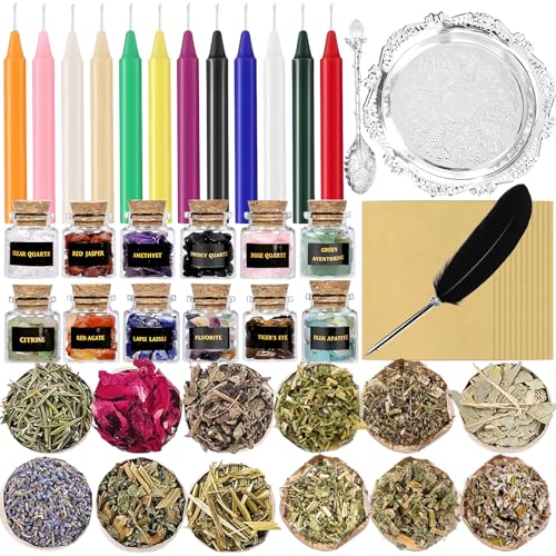 Rileryan 51 PCS Witchcraft Supplies Kit Wiccan Altar Supplies and Tools Witch Crafts Supplies Spell Kit Mini Crystals Witch Candles Witchy Gifts for Women Halloween Acessories
