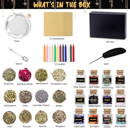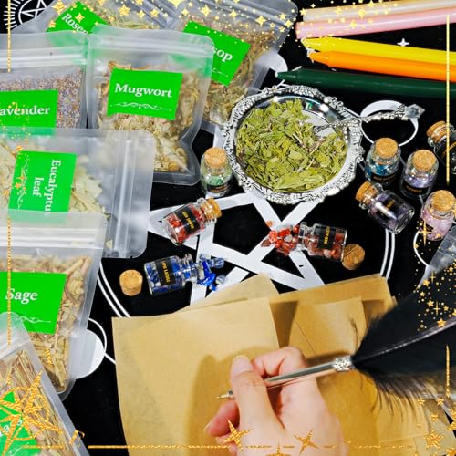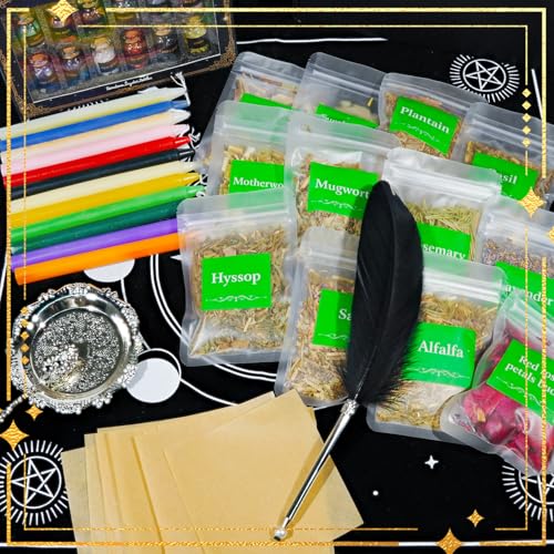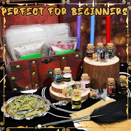 Complete Witchcraft Kit: This all-inclusive set features 51 high-quality Wiccan altar supplies, including mini crystals, spell candles, ritual tools, and more—perfect for beginners and experienced practitioners