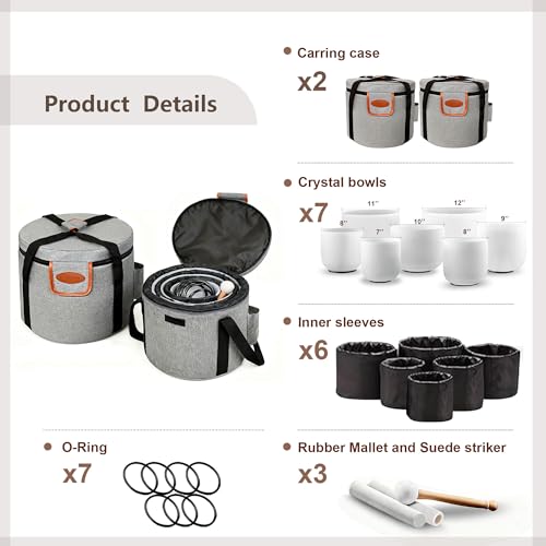 Complete Chakra Healing Kit: The RYAN DVAN Sound Healing Crystal singing bowls set includes 2 carrying cases, 2 suede strikers, 1 rubber mallet, and 7 O-rings.6 black inner sleeves, The bowls range in size from 7 Inch to 12 Inch and include the following chakra bowls: 12 Inch Root, 11 Inch Sacral, 10 Inch Solar Plexus, 9 Inch Heart, 8 Inch Throat, 8 Inch Third Eye, and 7 Inch Crown.