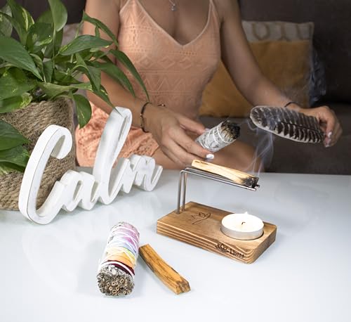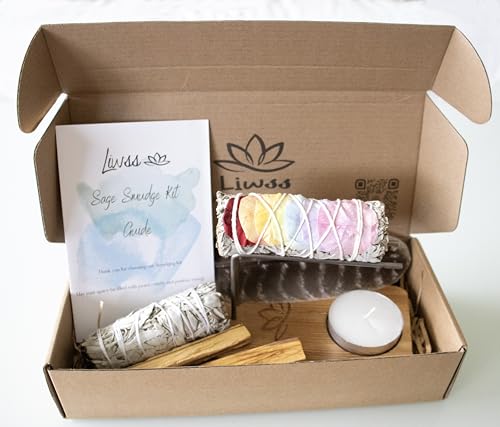 Sage & Palo Santo Smudge Kit – Natural Wood Holder, White Sage Sticks, Palo Santo from Peru, Smudging Feather & Guide – Cleanse & Meditation Gift Set
