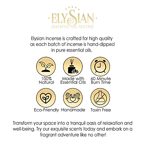 ELYSIAN incense is crafted for quality as each batch of incense is hand dipped in pure essential oils. These incense sticks emit a mellow, earthy scent that delightfully lingers in the room without overwhelming the space & refreshes the mind and the body.