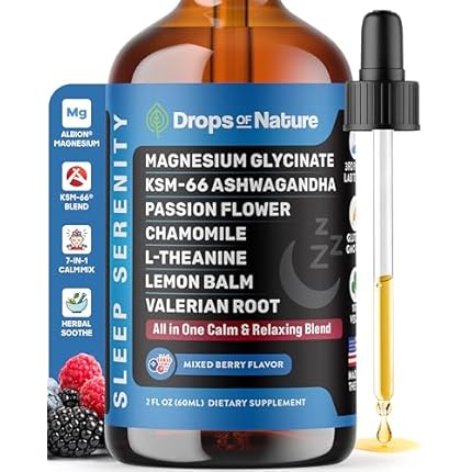 Magnesium Glycinate & Ashwagandha Liquid Drops with Valerian Root, Chamomile, Passion Flower, Lemon Balm & L-Theanine – Vegan Fast Absorption – Supplement for Wellness & Relaxation (Mixed Berry, 60mL)