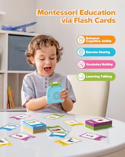 Toddler Montessori Learning Device: This educational talking flash card features 224 colorful illustrations and sounds. It includes animals, vehicles, food, fruits, and vegetables etc. Kids can expand their vocabulary and enhance cognitive skills while playing