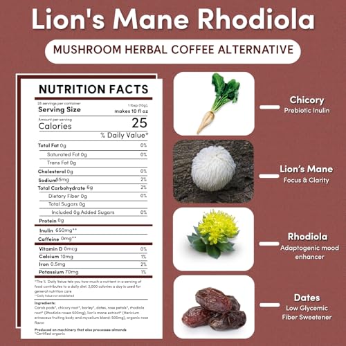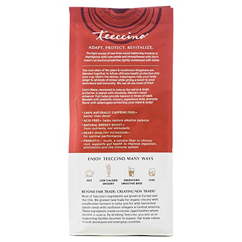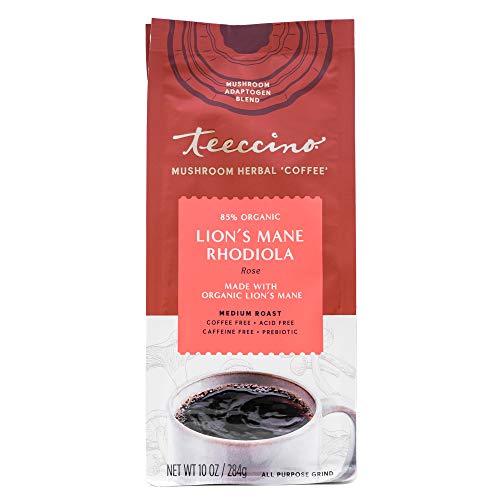 Teeccino Lion’s Mane Rhodiola Coffee Alternative – Rose – Adaptogenic Herbal Mushroom Coffee, Medium Roast, Caffeine Free, Prebiotic, Acid Free, All-Purpose Grind – 10 Oz