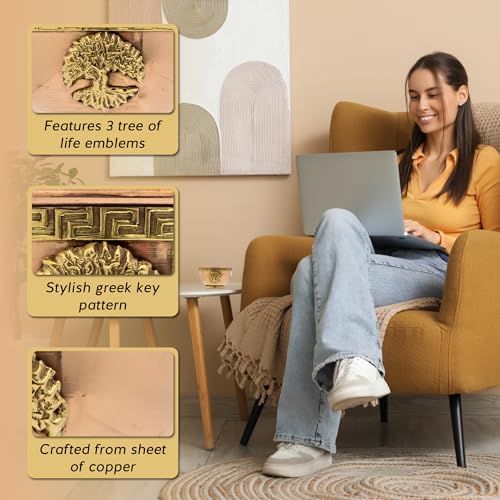 This handheld bowl is made from a shaped sheet of copper, trimmed with a stylish Greek Key pattern, and features 3 Tree of Life emblems. Its sturdy design makes it water resistant, fire resistant, and easy to clean.