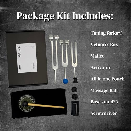 Complete Healing Set with Premium Accessories. Includes 128Hz, 256Hz, and 512Hz tuning forks, a tuning fork activator, mallet, rubber ball, screwdriver, and a velvet pouch for easy use, adjustment, and storage.