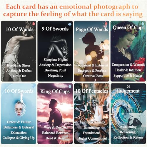Unique Tarot Deck: Beautiful Beginner Tarot deck with keywords and elements or for those that connect through visuals better. Each card has an emotional photograph to capture the feeling of what the card is saying along with keywords to help bring the concept of the card into perspective followed by your own intuitive thoughts.