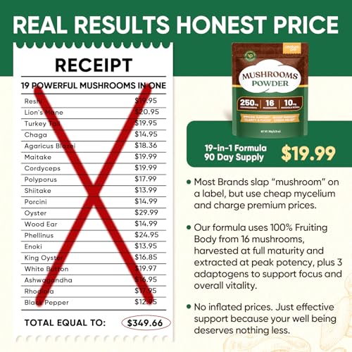 PREMIUM FULL-SPECTRUM 16-MUSHROOM EXTRACT BLEND: Packed with Lion’s Mane, Chaga, Turkey Tail, Reishi, Shiitake, King Trumpet, Cordyceps, Willow Bracket, Oyster Mushroom, Mesima, Agaricus Blazei, Maitake, Wood Ear, Enoki, White Button, and Porcini, each serving delivers 17,300mg of fresh mushrooms with a potent 10:1 extract ratio. Made from 100% fruiting bodies—no fillers, no mycelium—for maximum effectiveness