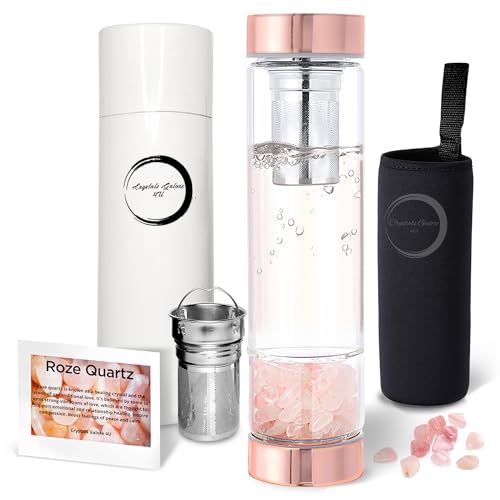 Crystal Water Bottle with Tea Infuser, Sleeve for Hot & Cold Elixirs, Rose Quartz, Eco-friendly Relaxing Healing Gifts for Women & Birthdays, Clarity Love and Spiritual Awareness