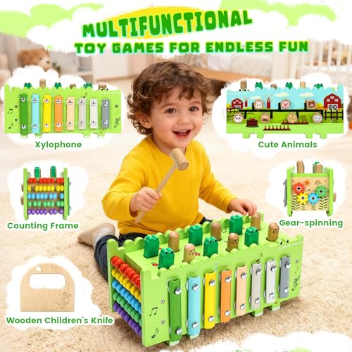 Unique and Refined Montessori-Inspired Early Learning Design: Helps nurture and promote early sensory development and cognitive skills. Hammering and tapping toy games encourage fine motor skill development, while the child-safe wooden knife for pretend cooking improves hand-eye coordination. Xylophones stimulate children’s visual, auditory, and tactile senses. Abacus learning toys and gear-turning activities cultivate early math, counting, and logical thinking skills. Designed for endless exploratory fun while keeping little hands and minds engaged and focused.