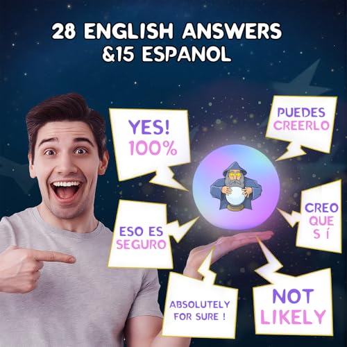 ►[Fortune Teller Ball]:Toys speaker at the Bottom, Ask a YES/NO question and Touch orb’s top or Beat table nearby to awaken wizard. It brings much fun for family! 28 English & 16 Espanol Answers.
